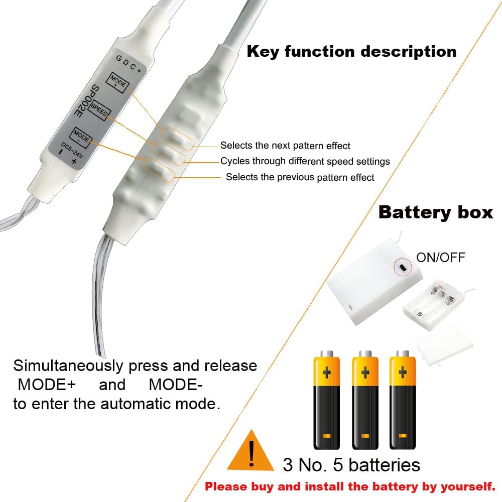 Please note: This model has the adjustment mode on the back of it. Modes and lighting effects can be adjusted by pressing the buttons on the back. And it does not come with battery.