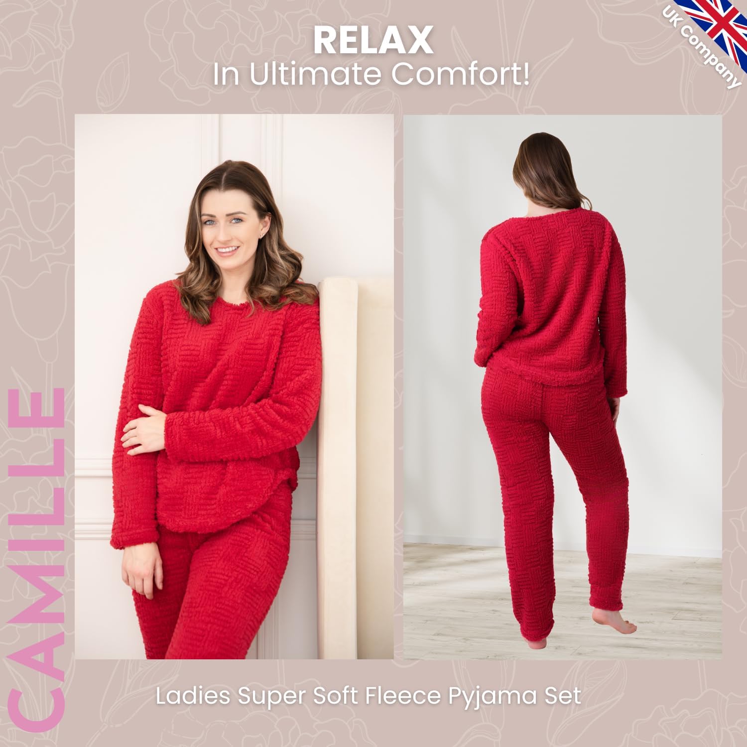 Camille Ladies Pyjamas – Jacquard Sherpa Fleece | Cosy Lounge Wear Set | Long Sleeves, Crew Neck & Elastic Waist | Warm & Snug 2-Piece PJ Top & Bottoms | Comfy Luxury