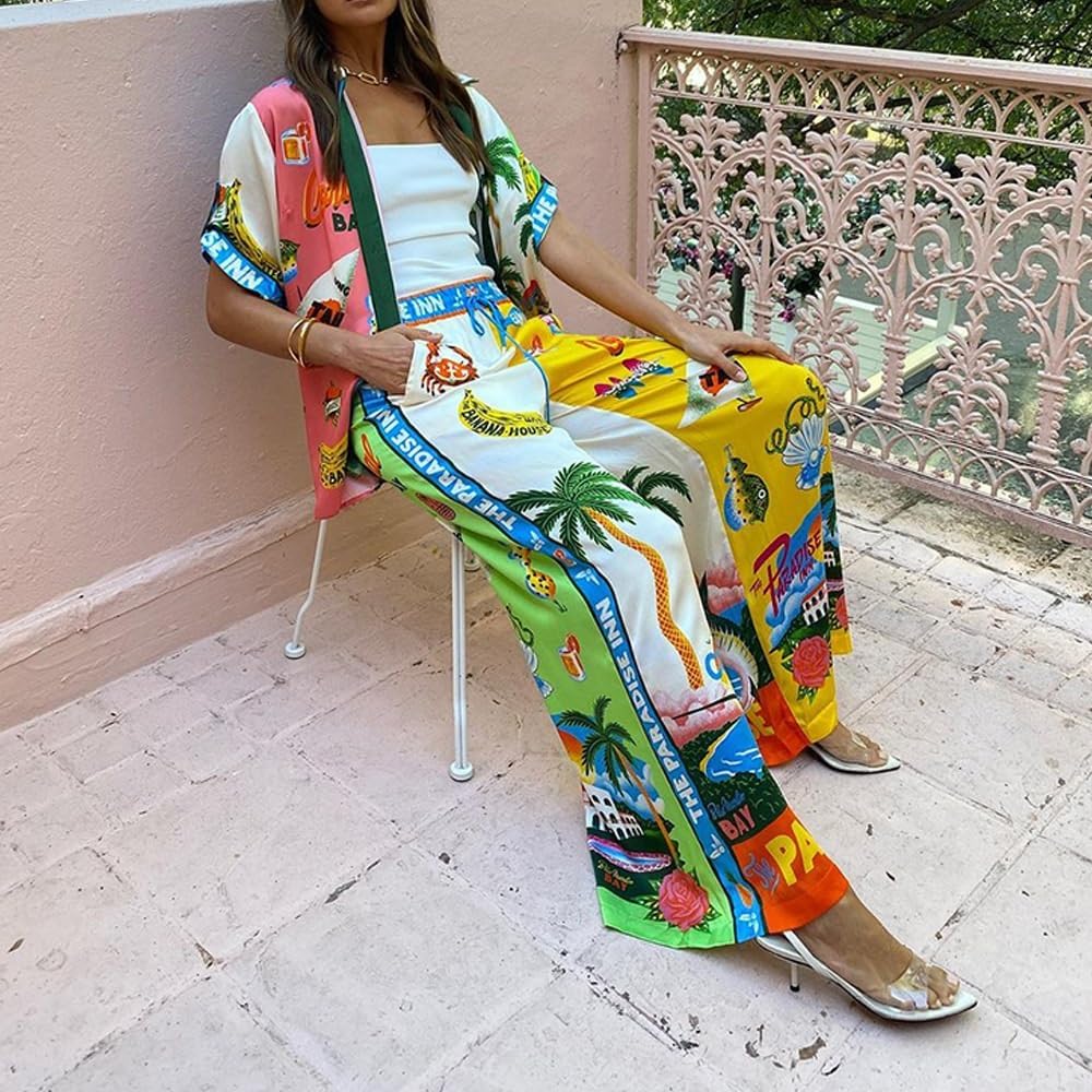 Casual Floral Print 2 Piece Women Short Sleeve Button Lapel Shirt Wide Leg Pants Holiday Hawaii Summer Beach Outfits